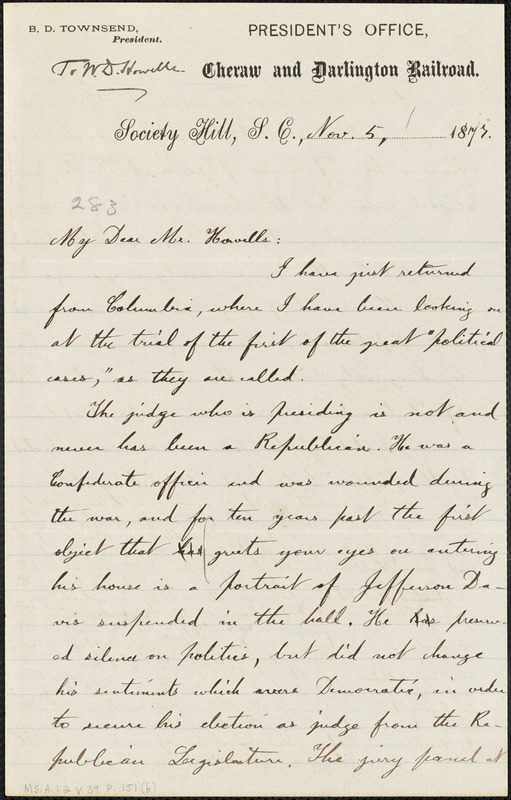 Letter From Belton O Neall Townsend Society Hill S Outh C Arolina To William Dean Howells 1877 Nov Ember 5 Digital Commonwealth
